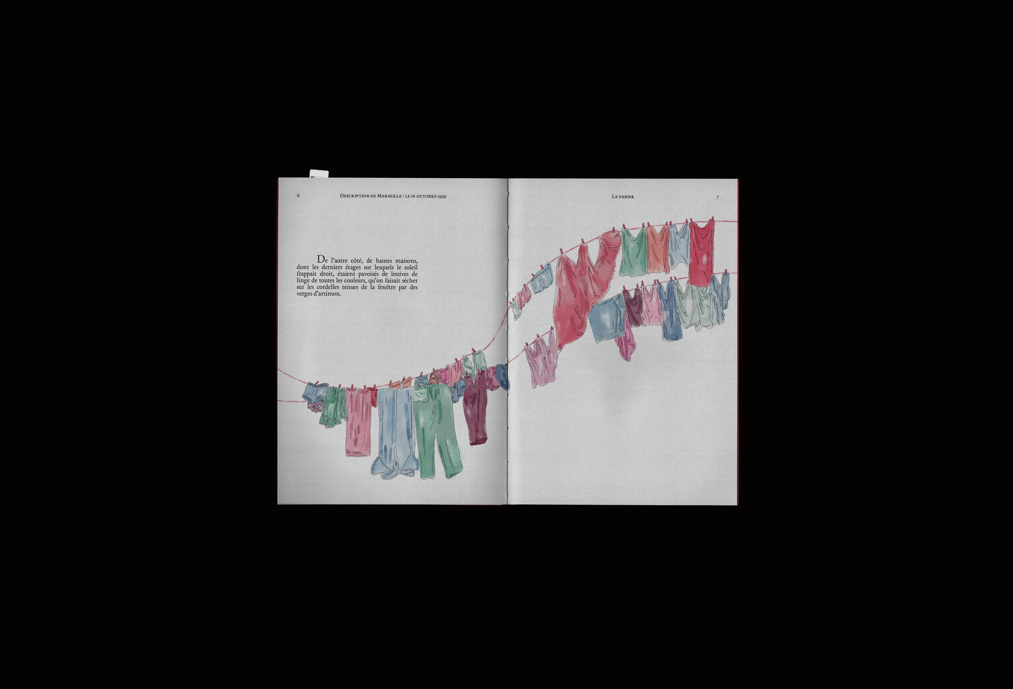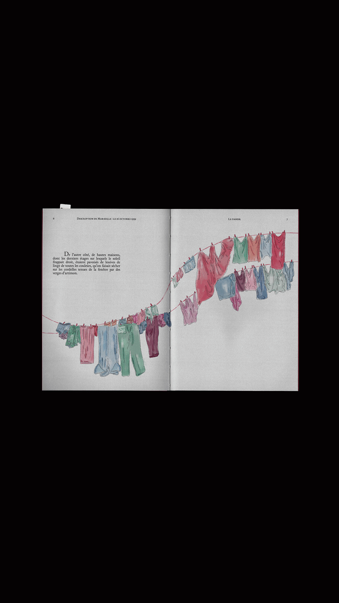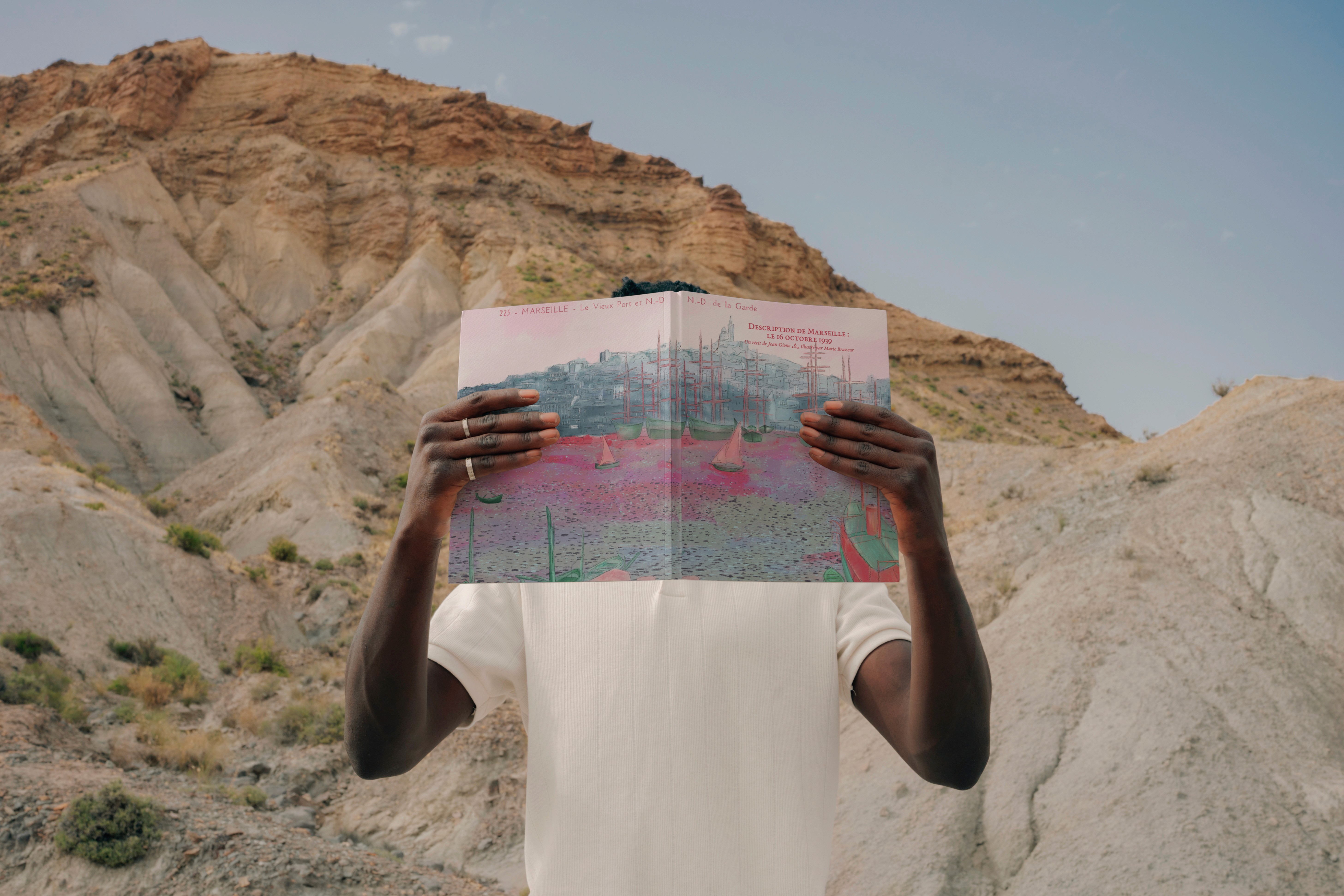 Livre illustré inspiré du texte "Description de Marseille : Le 16 octobre 1939" de Jean Giono. Le récit parcourt la ville comme un regard omniscient qui s’arrête sur des fragments de vie avant de poursuivre sa dérive. Les illustrations accompagnent ce mouvement et révèlent le merveilleux discret niché dans les scènes ordinaires du quotidien, faisant de Marseille le véritable personnage du livre.